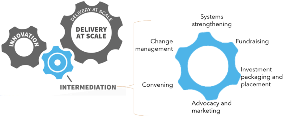 Intermediary: An entity that bridges the gap between innovation and large-scale adoption, facilitating connections between innovators, implementers, funders, and national systems.