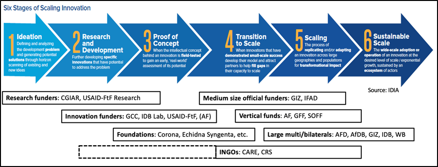 Early-stage funders, including innovation and research funders and some foundations, provide some of the most instructive cases of mainstreaming reflecting the fact that many of these funders were established with the explicit expectation of catalyzing impact at scale. Large official funders have the capacity and mandate to finance later-stage transformational scaling but often lag in operationalizing that capacity primarily due to reasons of longstanding institutional mechanisms, incentives and institutional culture, in particular their focus on one-off project funding. Vertical funds operating in particular development and climate areas (such as agriculture, health, weather observations, etc.) and INGOs help to bridge this divide when they partner effectively with large official funders, but this continues to be the exception rather than the rule in the absence of long-term funding commitments and/or coordinated action by all funders to cooperate in supporting the scaling pathway for its duration.
