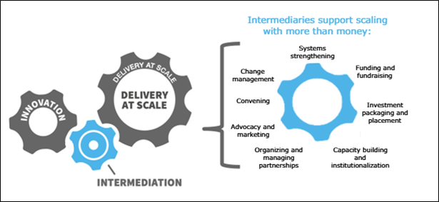 8. Elevate and strengthen intermediary roles. The lack of effective intermediation across the scaling pathway contributes to the stubborn persistence of unscaled pilots and the “Valley of Death” for promising innovations and interventions. Funders can be of great assistance when they go beyond traditional project financing and support local intermediaries – or use their own good offices – to broker handoffs across scaling stages, convene partners, and strengthen coordination structures, such as country platforms (Figure 2). When this role is weak, limited to technical support, or overly transactional, gaps persist along the scaling pathway, reinforcing the “Valley of Death” for promising innovations and interventions.