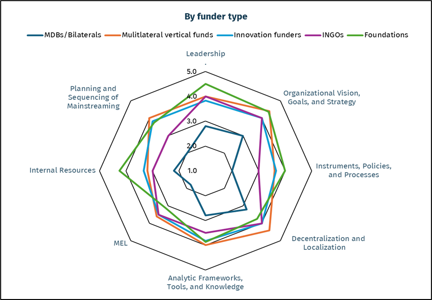 Note: With the help of NotebookLLM, each funder case was scored on a scale of 1 (least) to 5 (highest) with respect to those elements of the Mainstreaming Tracker Tool (MTT) that corresponded to the eight key mainstreaming factors in the text. Scoring criteria are based on the SCoP’s Mainstreaming Tracker Tool.